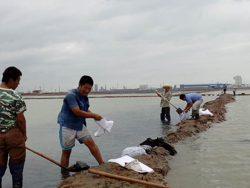 災情發(fā)生后,公司立即啟動防汛應急預案,迅速組織干部職工開展生產(chǎn)自救,積極做好救災抗災工作,確保公司財產(chǎn)、人員安全。整個防汛抗災過程中,一線干部職工發(fā)揚“戰(zhàn)天斗地”的滄鹽精神,眾志成城、嚴防死守、抗災搶險,采取外堵(堵住外圍水不進場區(qū))、下疏(重新開通入海泄洪口3處)、內(nèi)保(保住駁鹽溝、導水路護灘埝不決口)的有效措施,先后排除各類險情245處,最終奪取了抗災保產(chǎn)的階段性勝利。