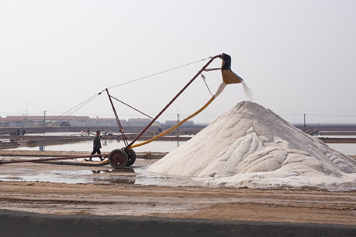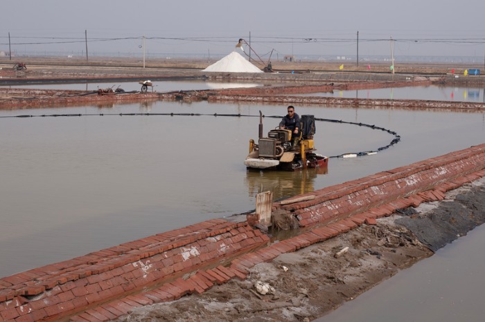 鹽田中,鹵水潺潺泛著浪花,鹽粒滾滾聚攏成山,鹽晶剔透閃光芒,機(jī)器轟鳴奮力前行,鹽工扶舵細(xì)操作,勾畫出一幅豐收繁忙的景象。