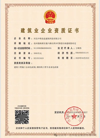 5月26日,河北中鐵滄鹽建筑科技有限公司成功實(shí)現(xiàn)了資質(zhì)證書的升級(jí),資質(zhì)類別及等級(jí)正式提升為建筑工程施工總承包貳級(jí)、鋼結(jié)構(gòu)工程專業(yè)承包貳級(jí)。